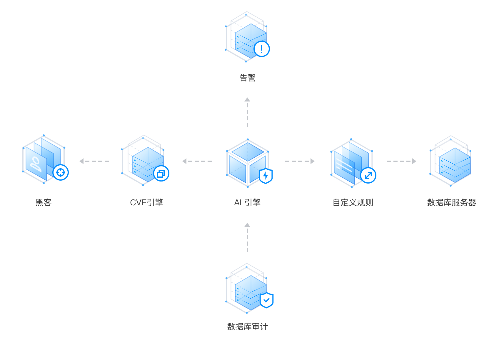 依托专业的深度学习算法模型和海量样本训练环境,AI 引擎能够应对变化多端的攻击场景,对各类变体攻击以及非常见威胁操作实现监控。在数据攻击日益多样化的今天,数据安全审计将为数据库安全提供更为精准的威胁分析和告警。