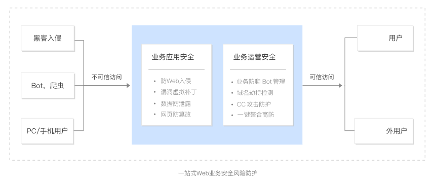 Web 应用防火墙(WAF) 是一款专业为网站及Web服务的一站式智能防护平台。其防护原理是通过将原本直接访问Web业务站点的流量先引流到WAF防护集群,经过云端威胁清洗过滤后再将安全流量回源到业务站点,从而确保到达用户业务站点的流量安全可信。
